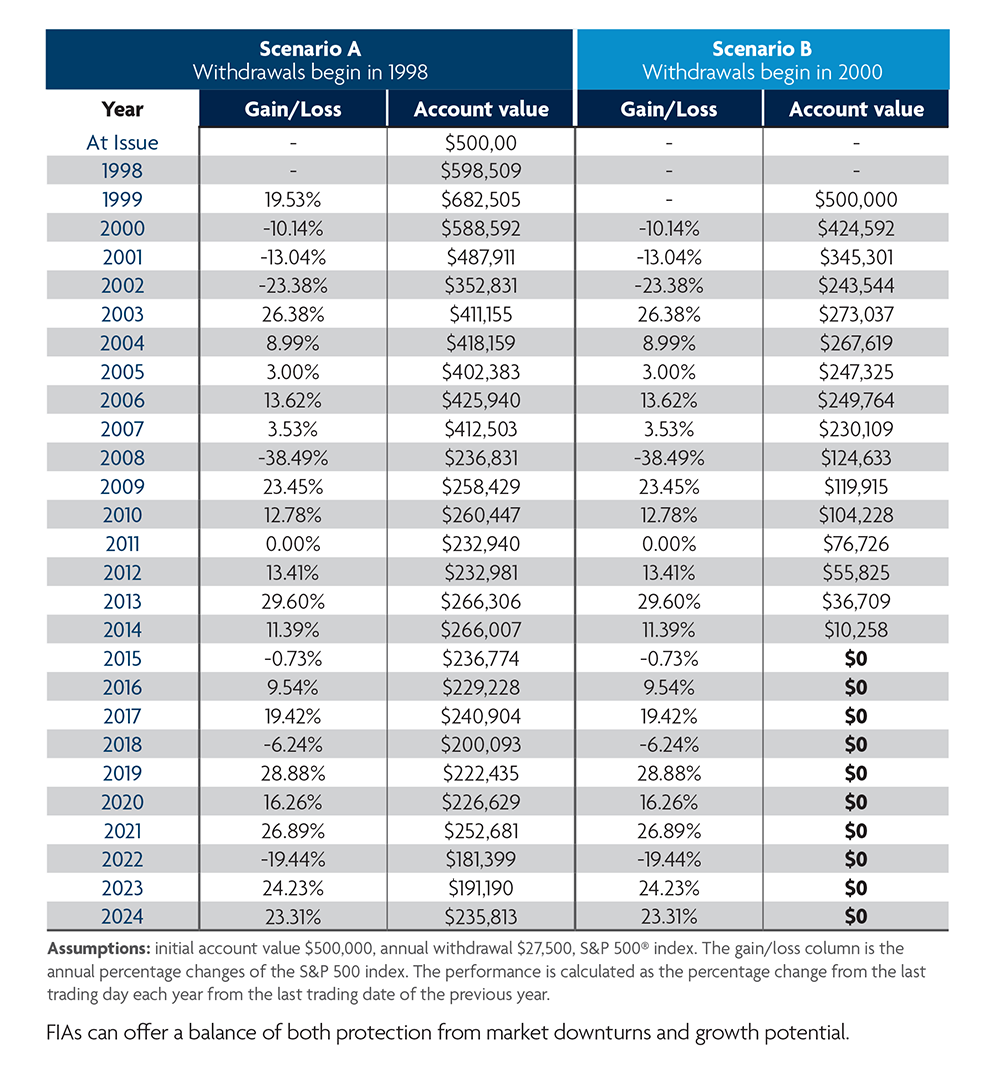 Let’s explore a hypothetical example of sequence of returns risk. In the two hypothetical examples provided, scenario A begins taking withdrawals in 1998, and scenario B begins taking withdrawals just two years later in 2000.1 Both have $500,000 at the time withdrawals begin. Twenty-one years later, with just a difference of two years from when withdrawals started, scenario A still has over $100,000, while scenario B’s account is depleted by year 15. For those looking to help mitigate the risk of potentially outliving retirement savings, a fixed index annuity (FIA) might be an option.