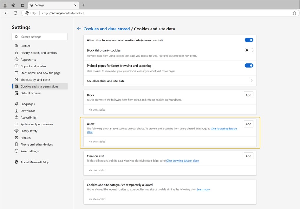 Click on the “Add” button that is located to the right of the sub-section titled, “The following sites can save cookies on your device. To prevent these cookies from being cleared on exit” as shown below